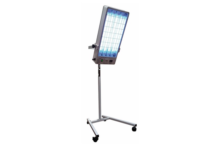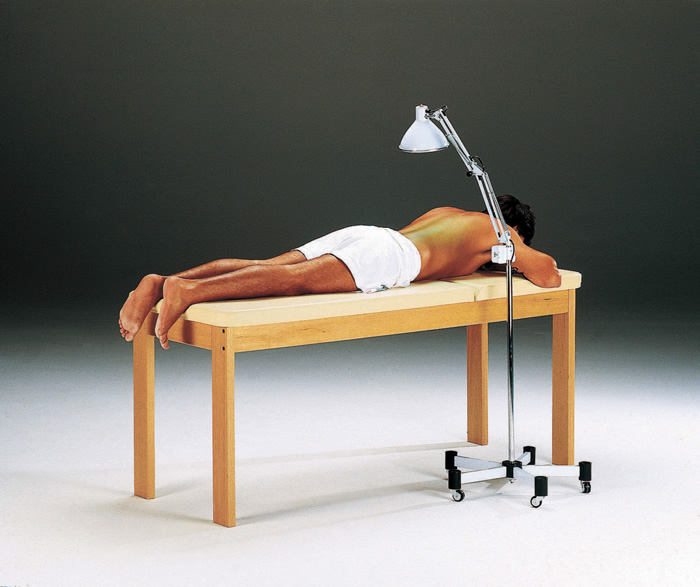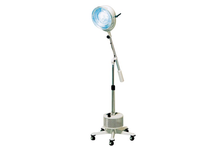 Professional lamp for UV- and IR-ray treatments mounted on a wheeld height-adjutable stand.