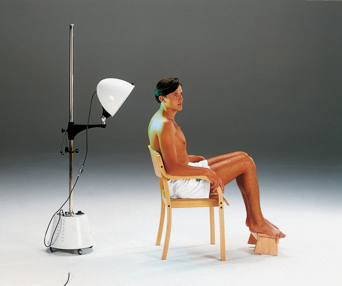 Lamp for UV-and IR-ray treatments mounted on a wheeled height-adjustable stand. Positioning by means of a swivel articulated arm. Power 550W.